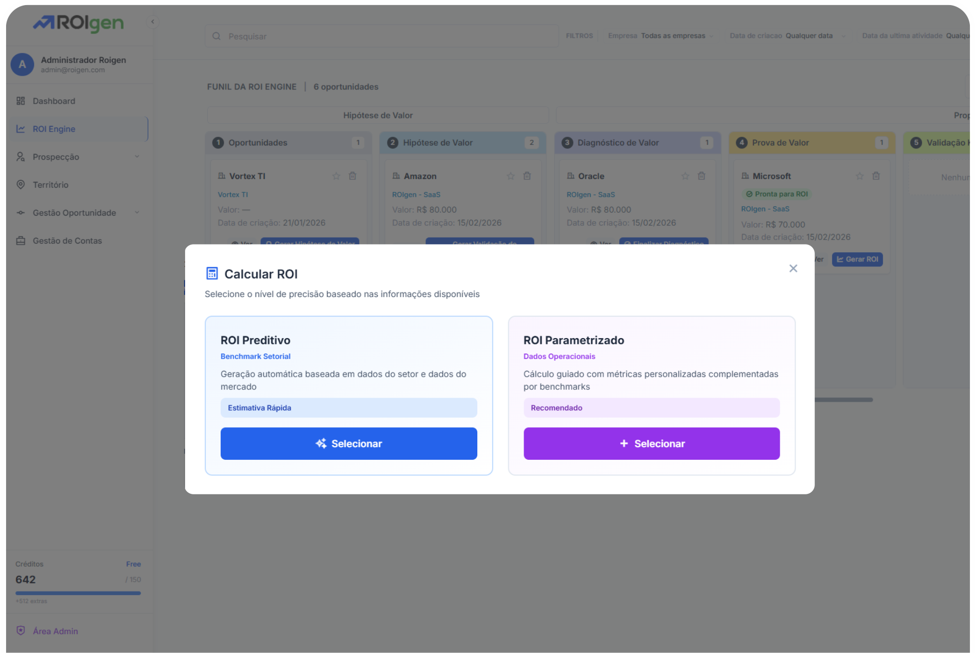 ROIgen entrega a metodologia e a ferramenta para estruturar conversas de valor desde o primeiro contato.